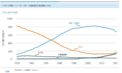 - 死亡場所の推移(厚生労働省、人生の最終段階における医療・介護参考資料、2023年)