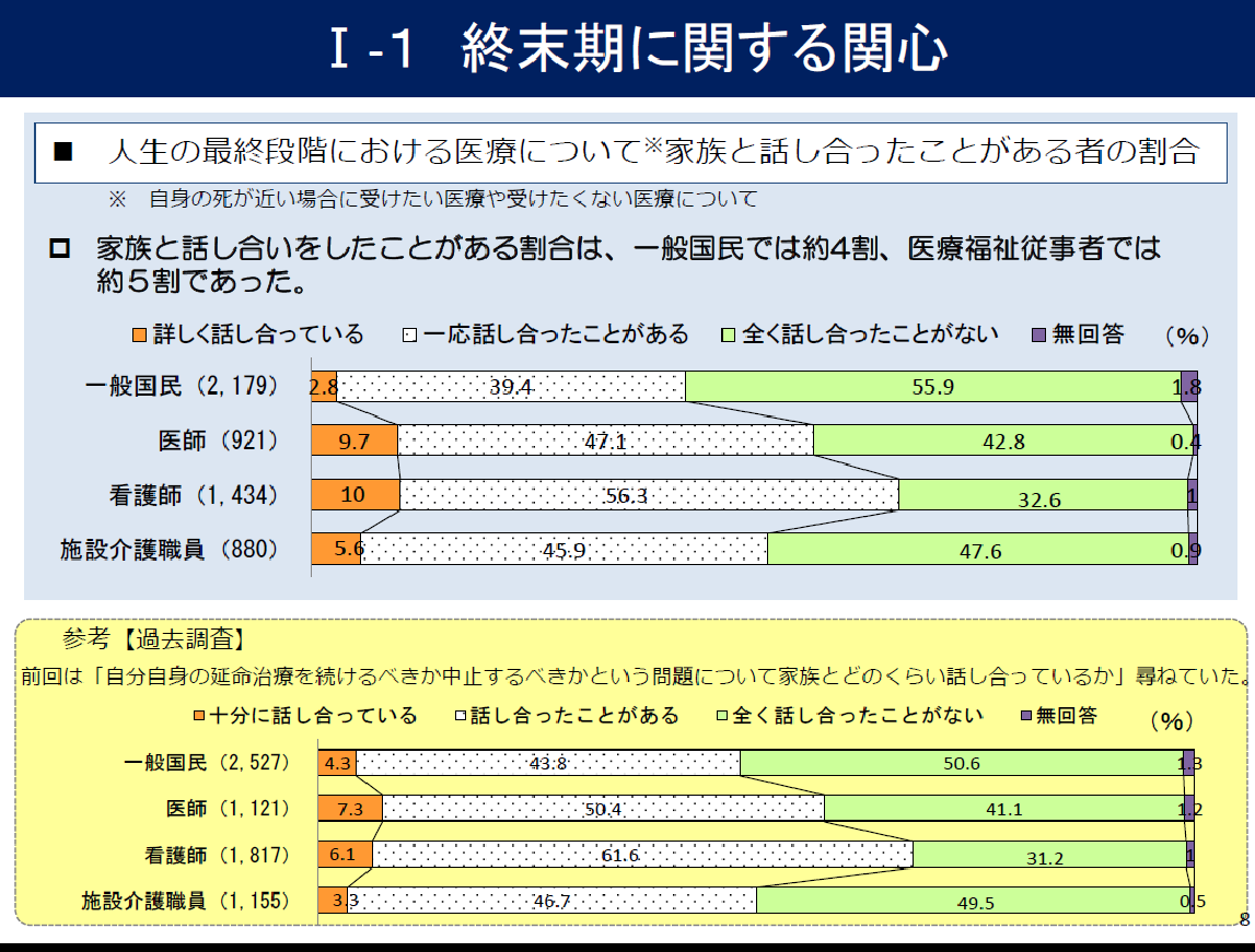 - 人生の最終段階における医療について家族と話し合ったことのある者の割合(厚生労働省、人生の最終段階における医療に関する意識調査――集計結果の概要、2008年)