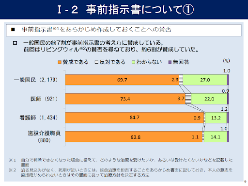 - 事前指示書(リビングウィル)をあらかじめ作成しておくことへの賛否(厚生労働省、人生の最終段階における医療に関する意識調査――集計結果の概要、2008年)